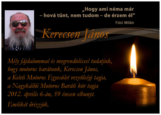 Kerecsen János, Jani búcsúztatására a nagykállói Köztemetőben 2012. április 13-án (pénteken) 14 órakor kerül sor.